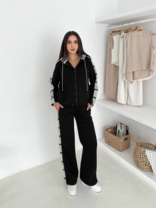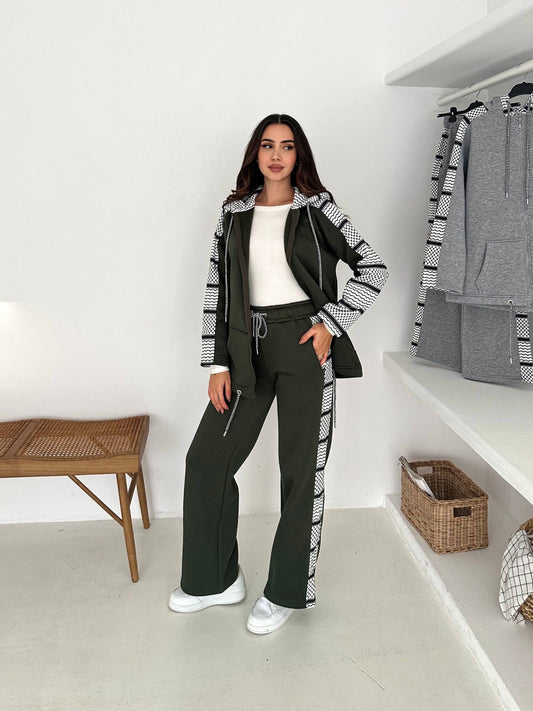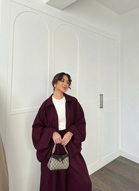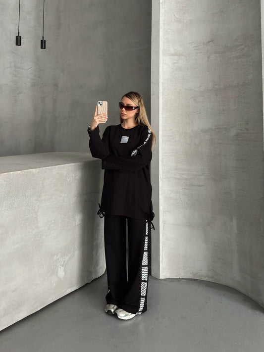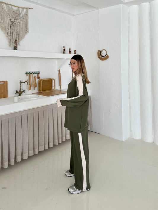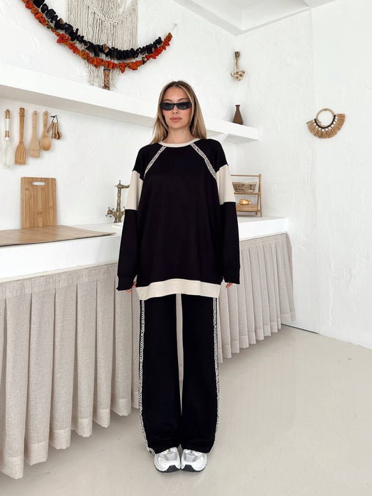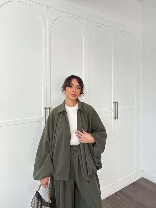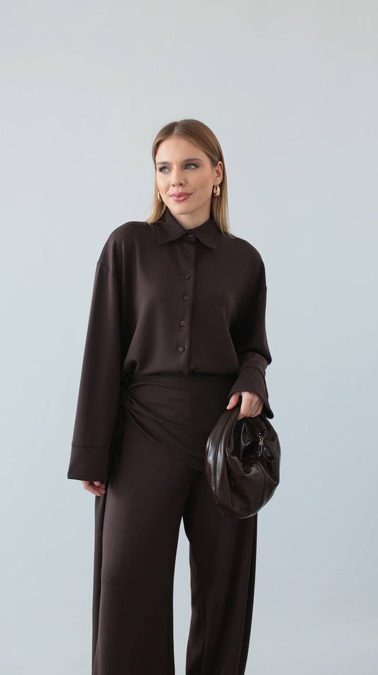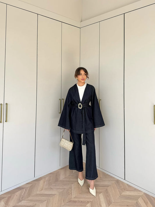 A relaxed, loose-fitting set with a flair-styled top featuring open sleeves and optional belt, paired with high-waisted pants. The pants include an elastic back for added comfort and a polished front design.