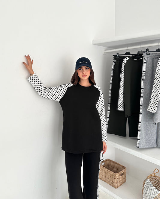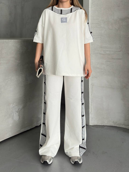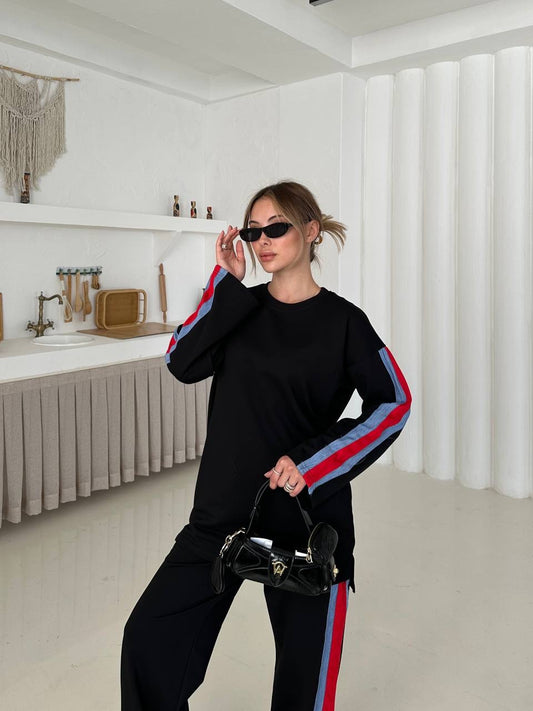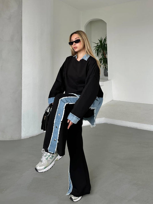 A relaxed, loose-fitting set with a flair-styled top featuring open sleeves and...