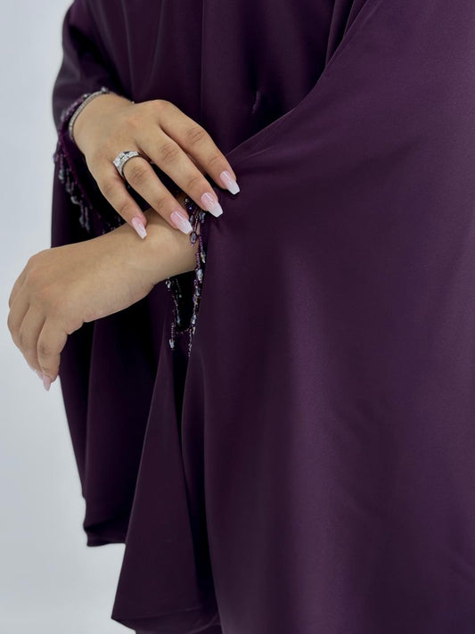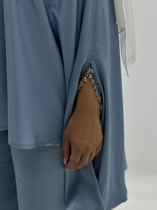 An elegant, loose-fitting silk set with butterfly sleeves and decorative hand accessories....