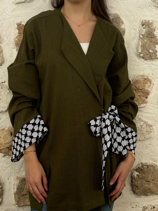 Introducing our stylish long-sleeve shirt, made from pure linen fabric. This shirt features a classic cut with a side belt to accentuate the waist. The sleeves are adorned with a distinctive keffiyeh pattern, while the rest of the shirt boasts a sleek and simple design. Perfect for various occasions, it seamlessly blends heritage with modern elegance.