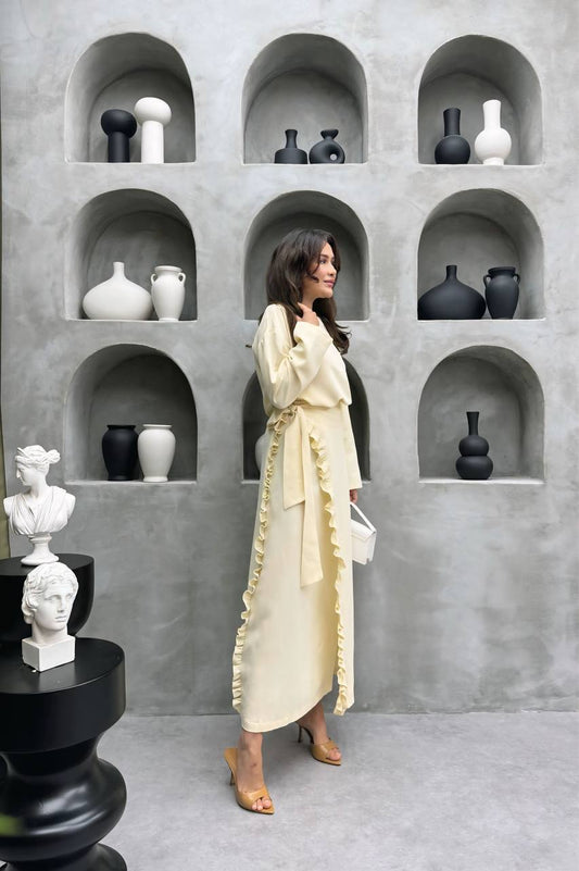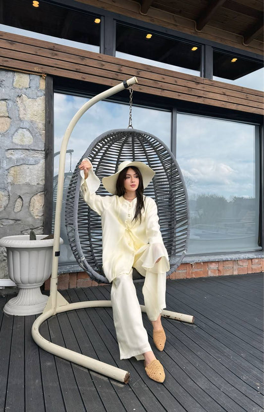 An elegant, loose-fitting silk set with butterfly sleeves and decorative hand accessories....