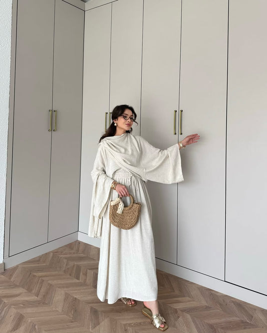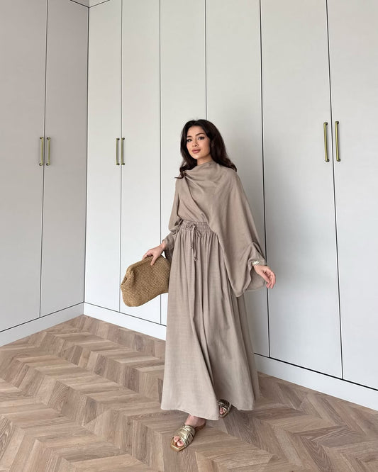 A relaxed, loose-fitting set with a flair-styled top featuring open sleeves and...