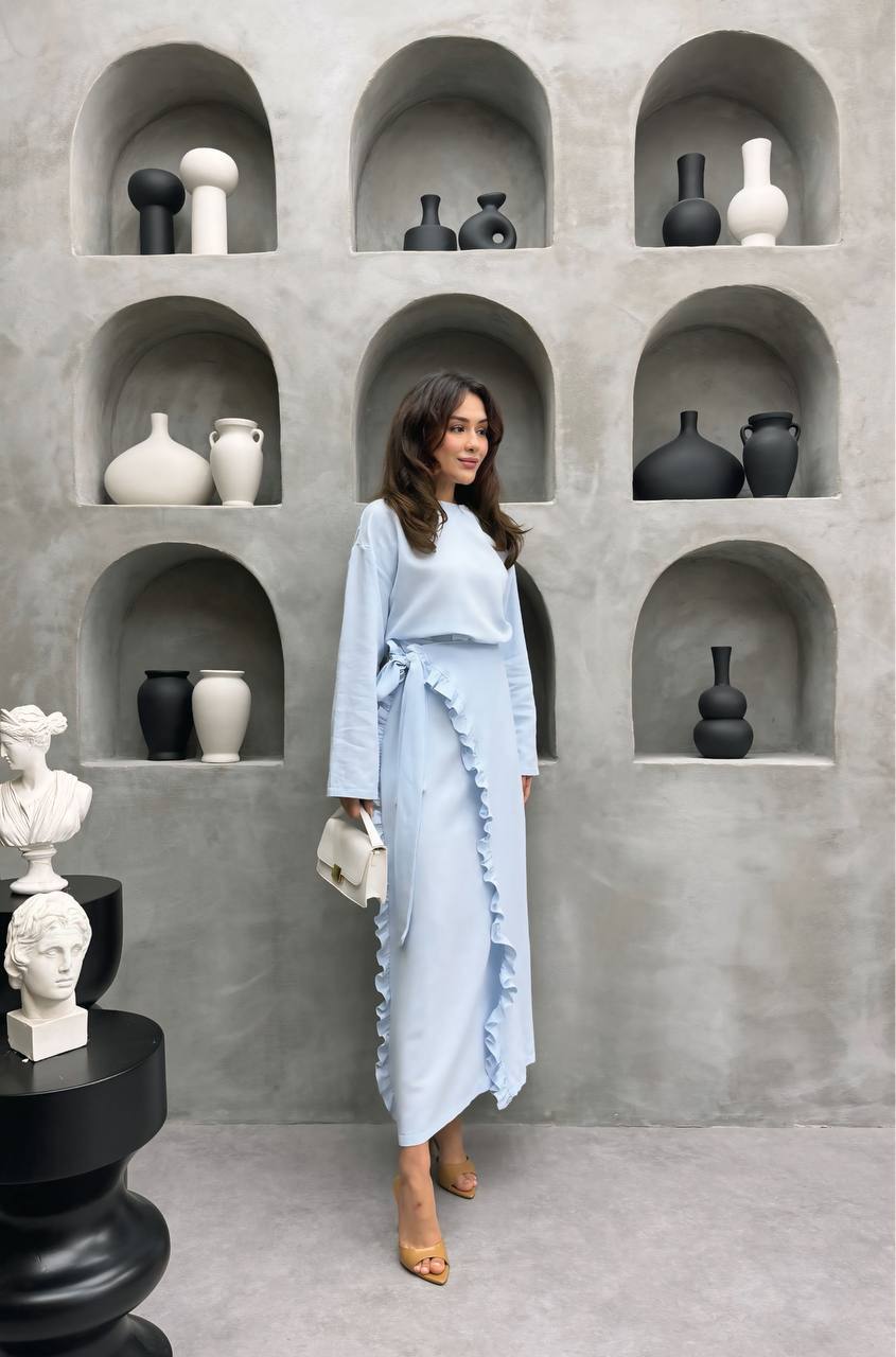 Step into summer with our best-selling two-piece set a flowy blouse with chic sleeves paired with a flattering high-waisted skirt in this year’s trending buttery blue shade 🌼