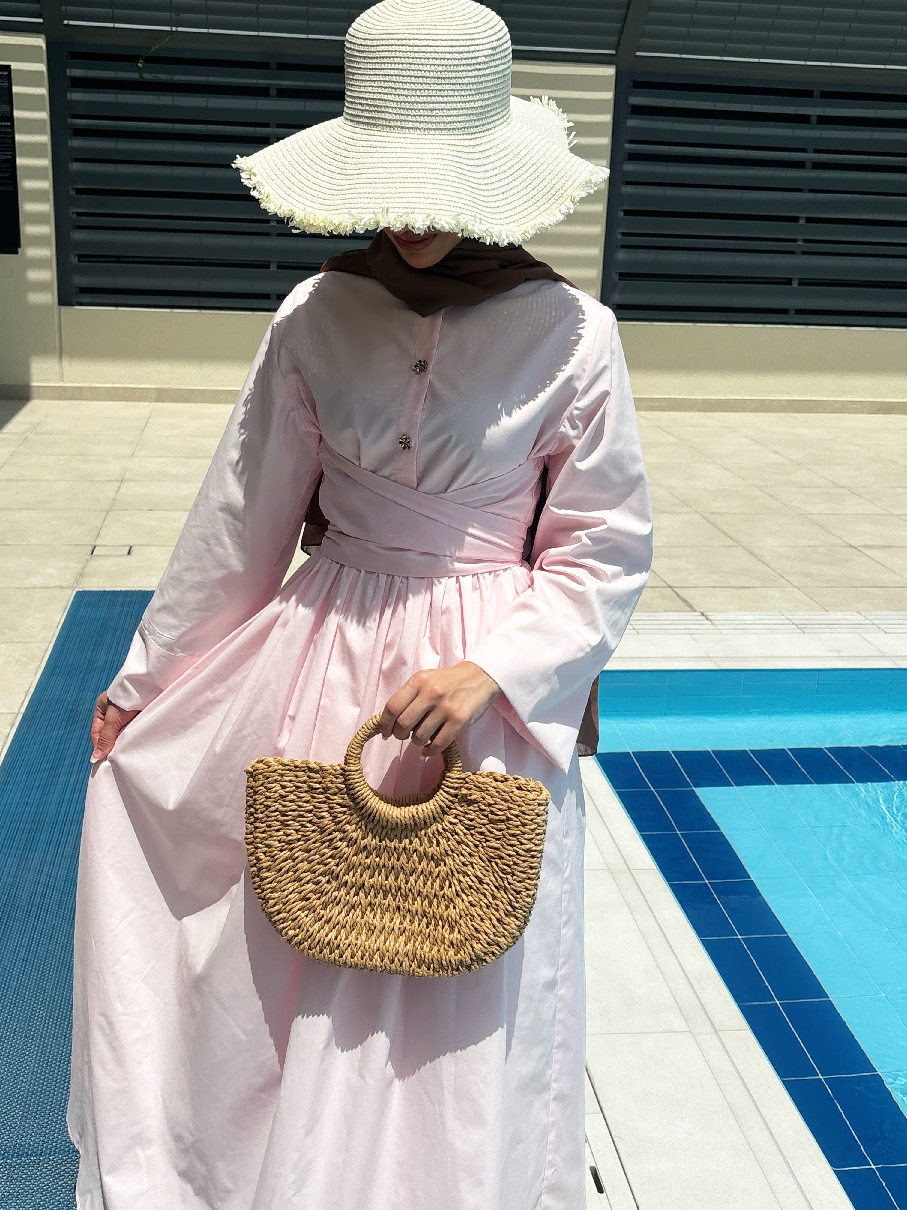 Elevate your summer wardrobe with this effortlessly elegant maxi dress, crafted from lightweight, breathable cotton and fully lined for complete coverage — no transparency guaranteed. The design features a flattering gathered waist, subtle pleats for graceful movement, and delicate front buttons. Its full-length silhouette and long sleeves bring timeless charm and modesty to your look. Perfect for sunny outings, brunches, or beachside strolls — just add a straw hat and you’re ready to glow.