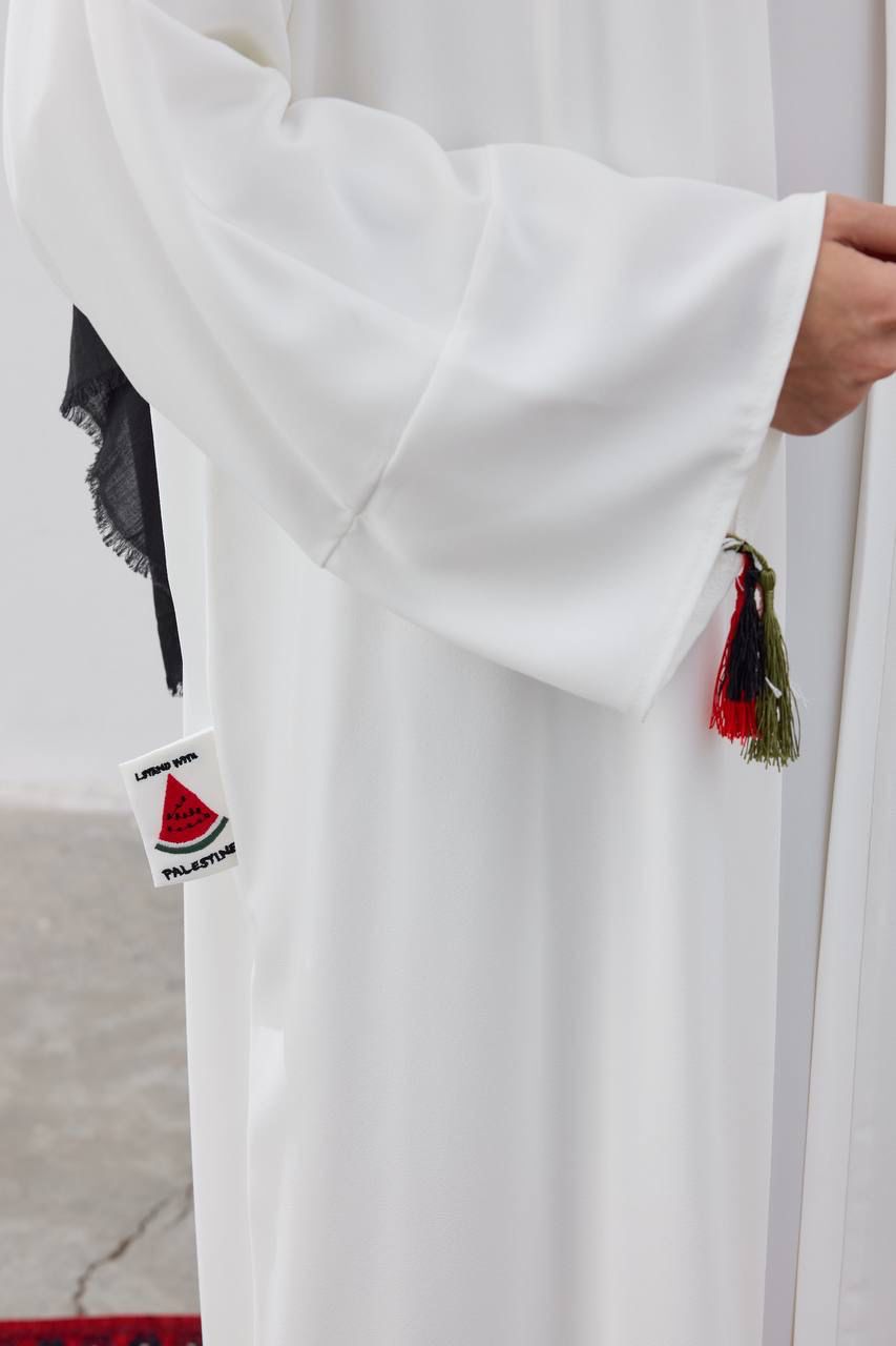 This elegant white abaya features a beautifully embroidered silhouette of Palestine adorned with floral motifs, each bloom representing resilience and heritage. Crafted from soft, high-quality fabric with a fluid drape, it offers both comfort and sophistication for any occasion.