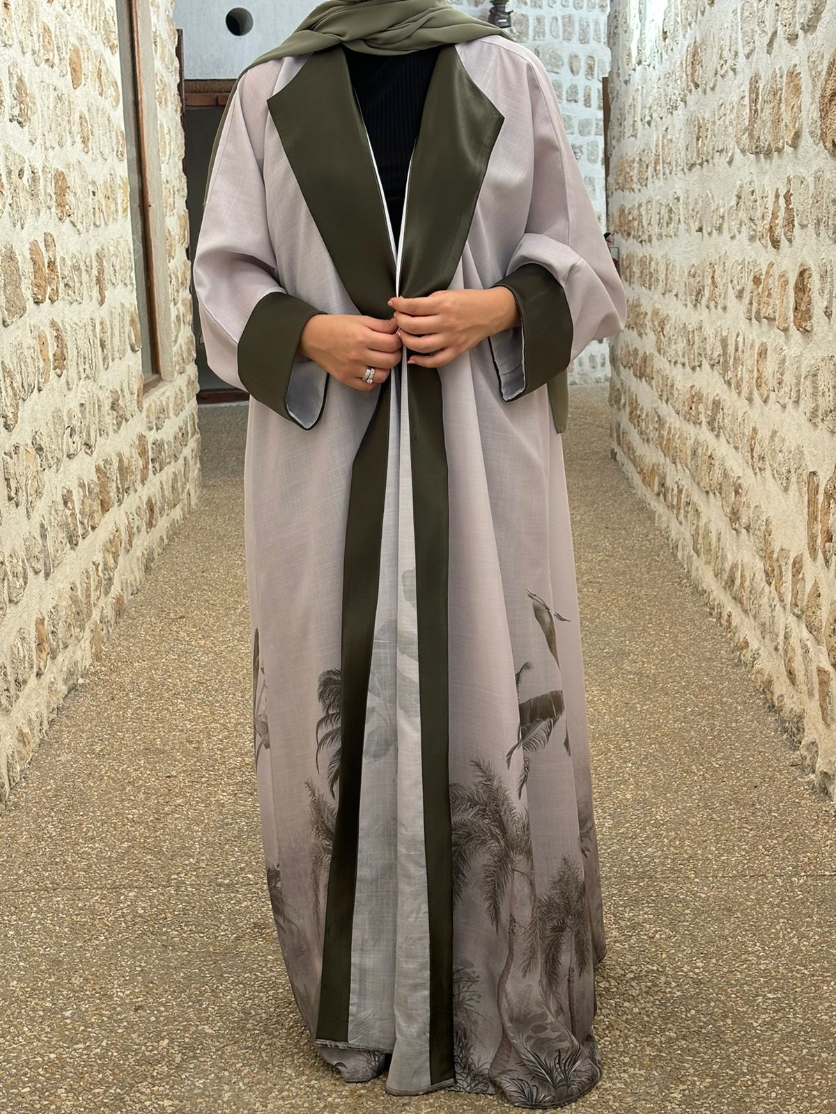 Elevate your style with the Palm Abaya, crafted from premium beige linen for a luxurious, soft touch. Detailed with satin accents on the sleeves and top, it’s finished with a graceful green palm pattern along the hem, adding a refined, nature-inspired elegance.
