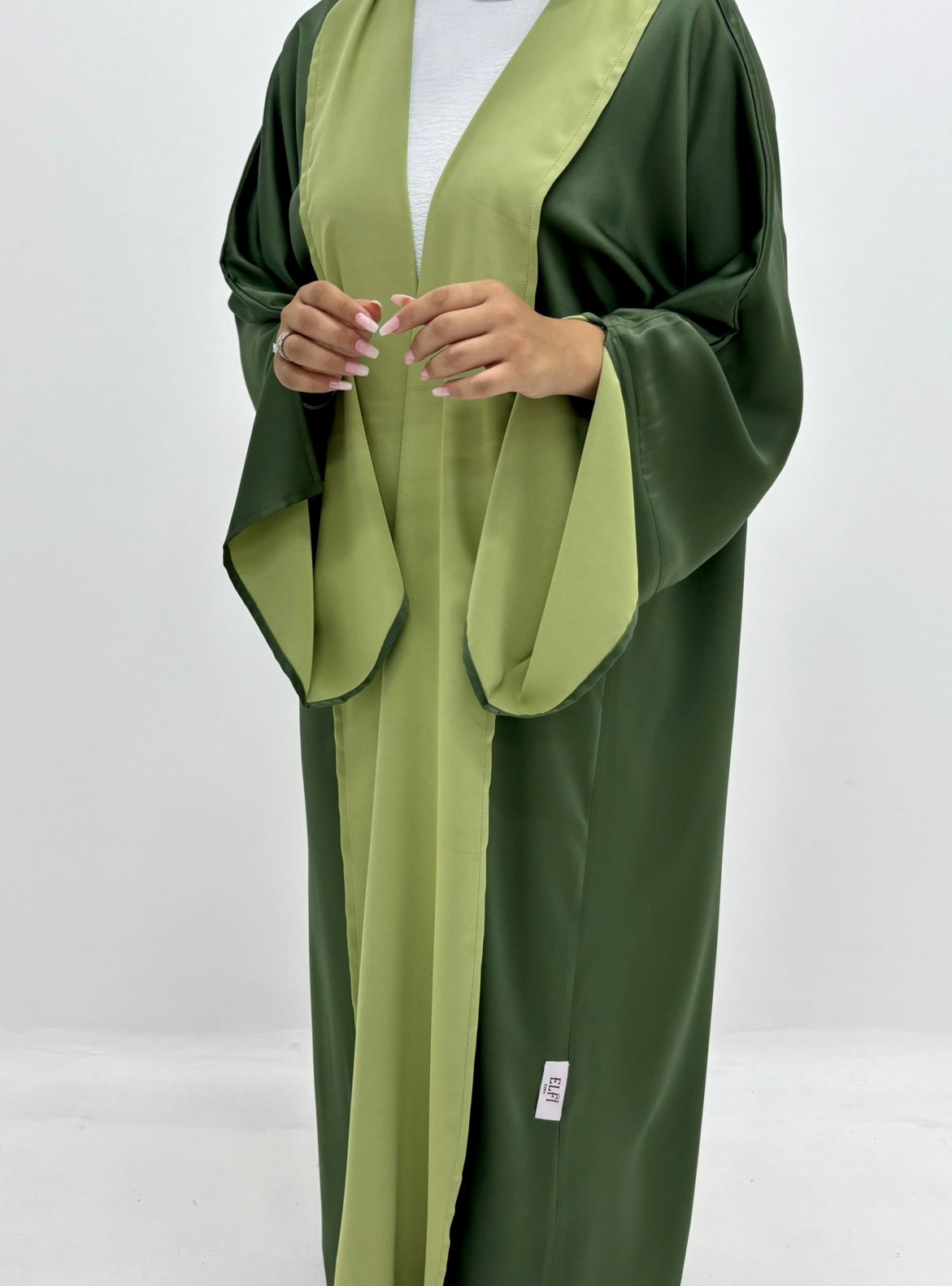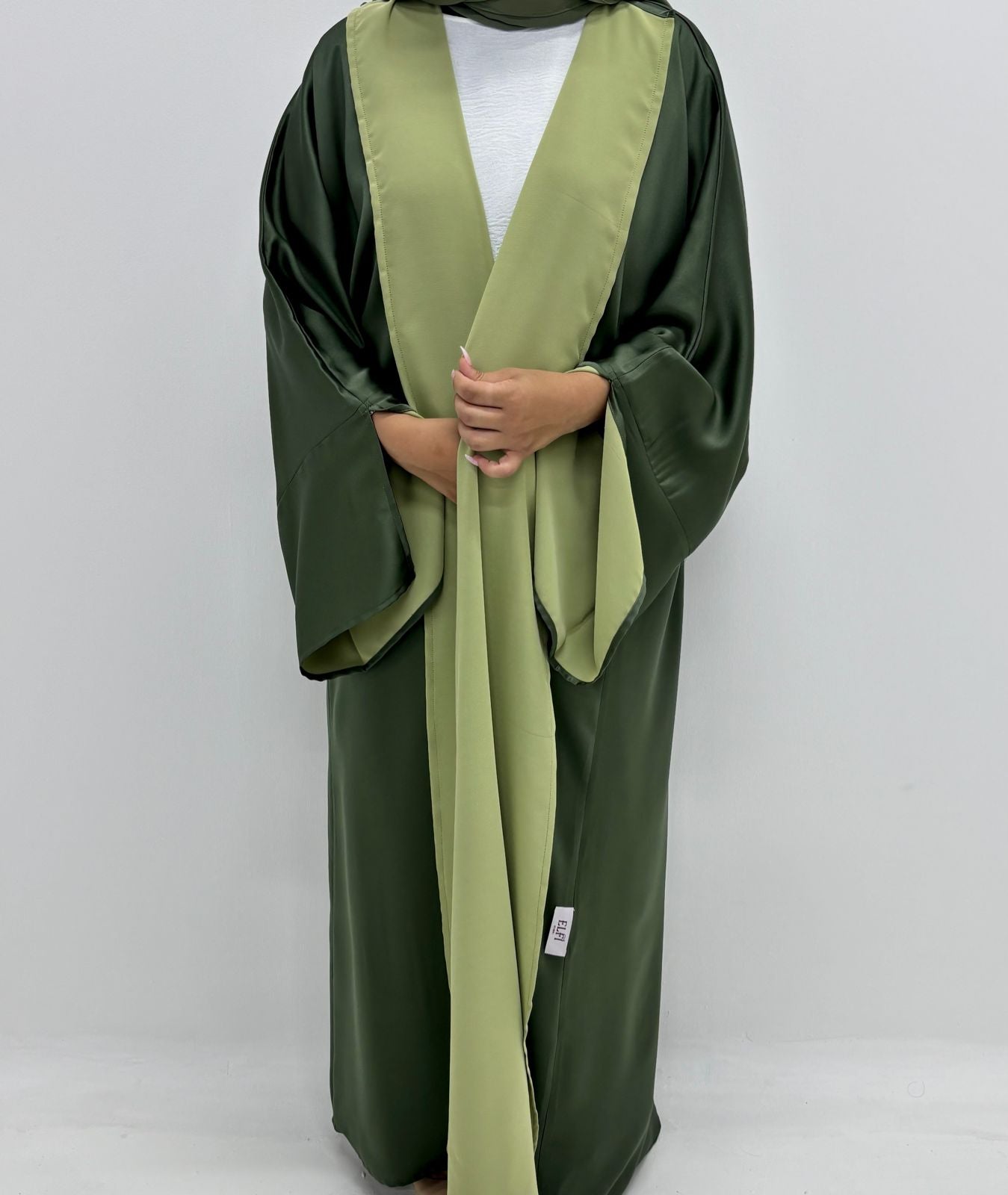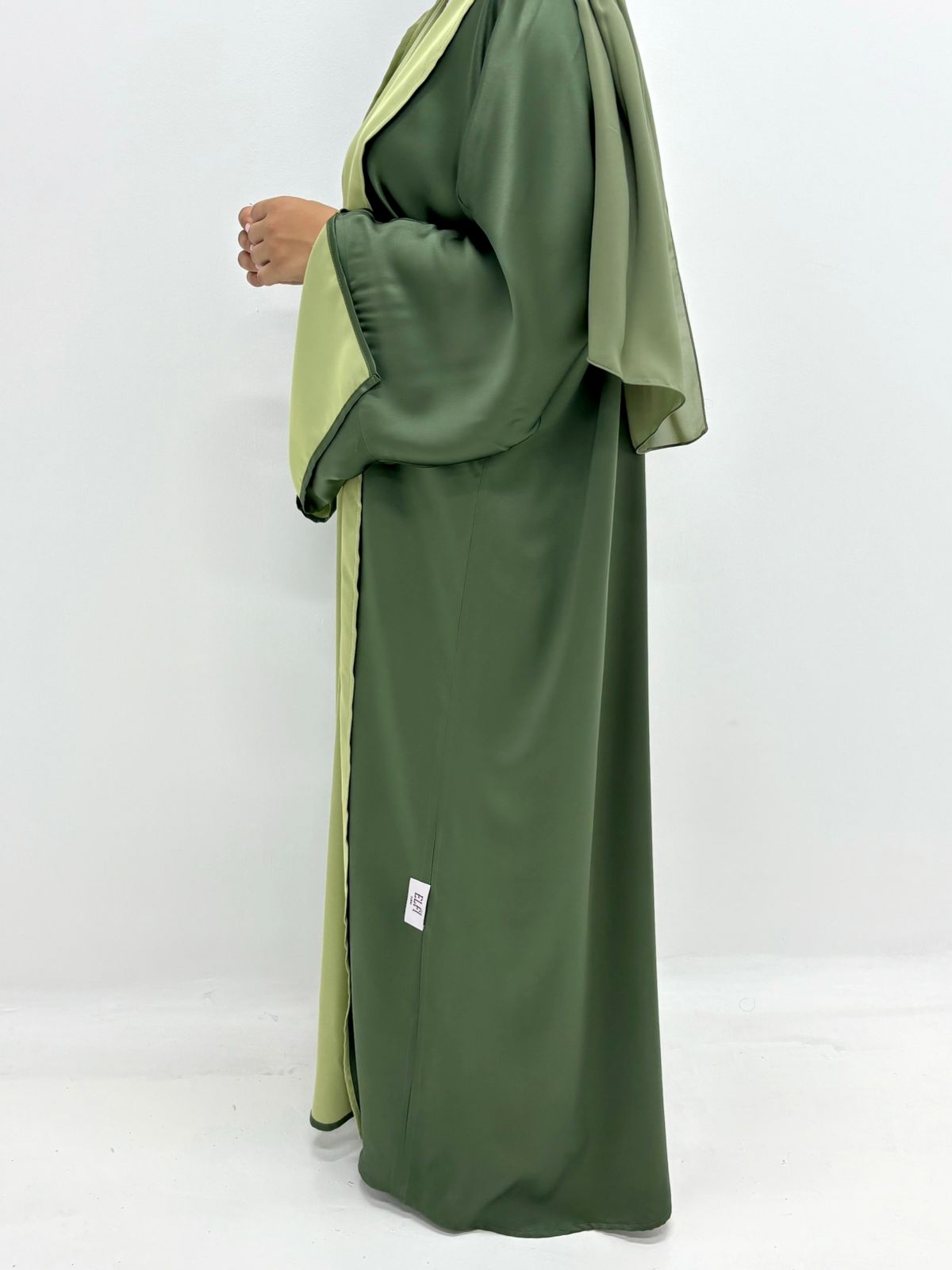 A versatile, double-face abaya with a unique open-sleeve design, allowing you to showcase both colors. Wear it on either side for a distinct look. Features include elegant side lines and a smooth finish, requiring minimal ironing.